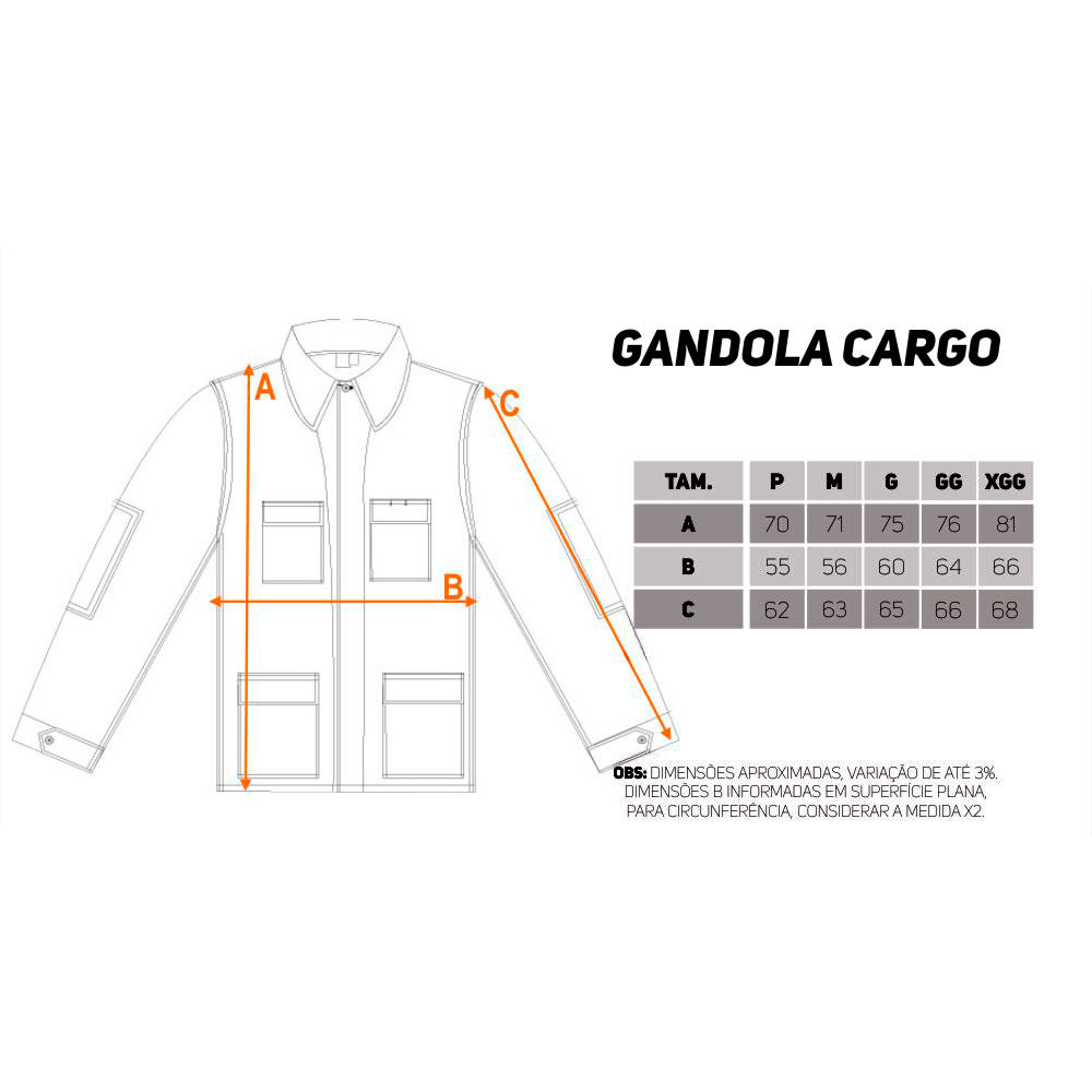 • GG — Comprimento: 82 cm | Largura: 62 cm | Manga: 66 cm